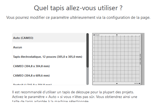 Ensuite, sélectionner le tapis de chargement que vous utiliser. Pour l'exemple, je vais prendre le tapis par défaut "CAMEO".