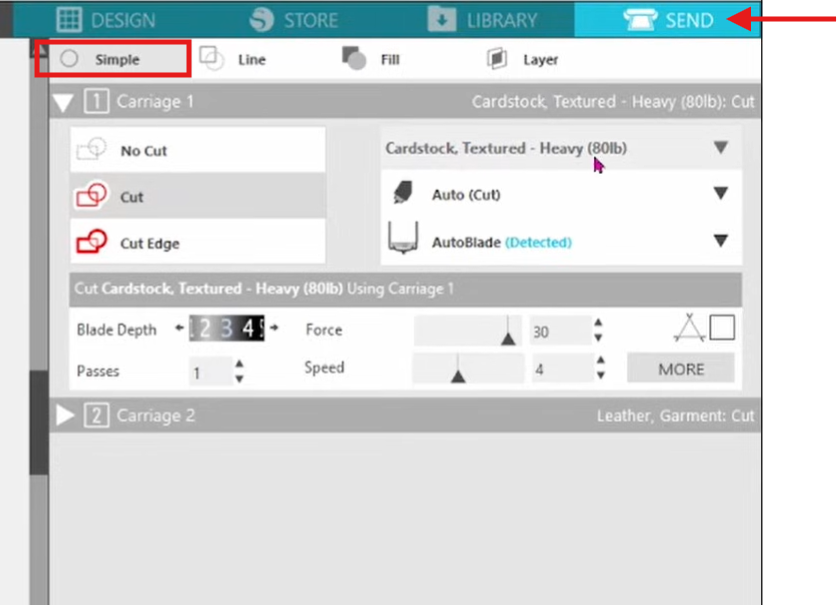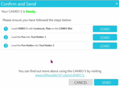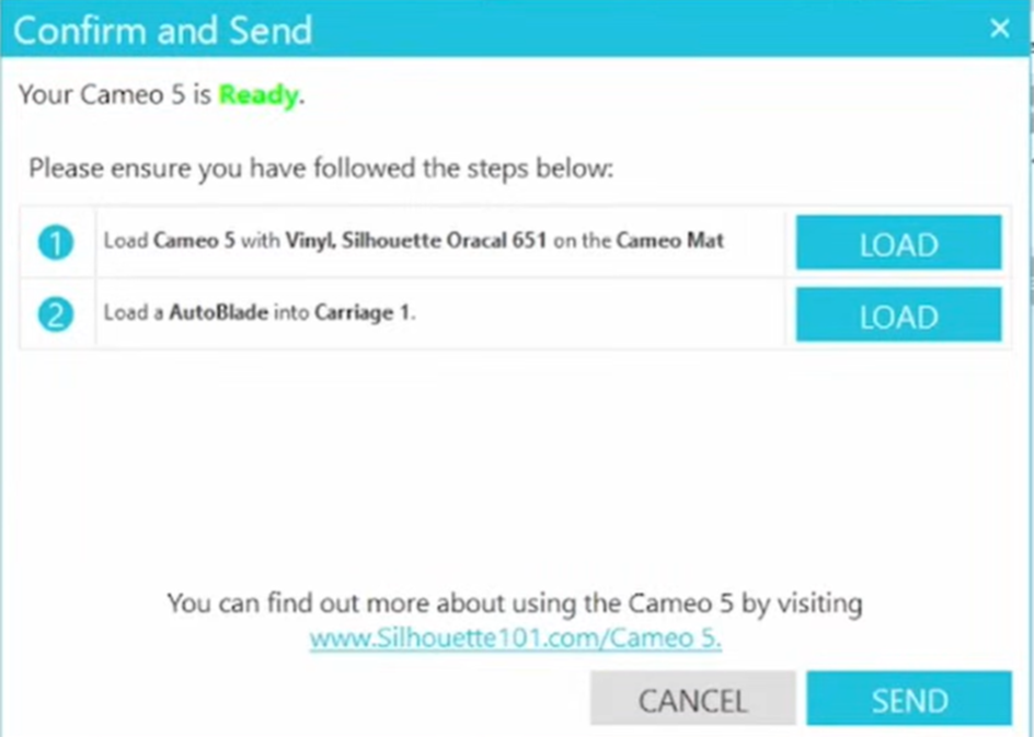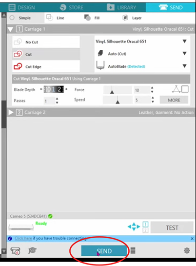 Vérifier que la tête d’outil de découpe est bien insérée, ainsi que le plateau de découpe. Puis, cliquez sur ‘SEND’.