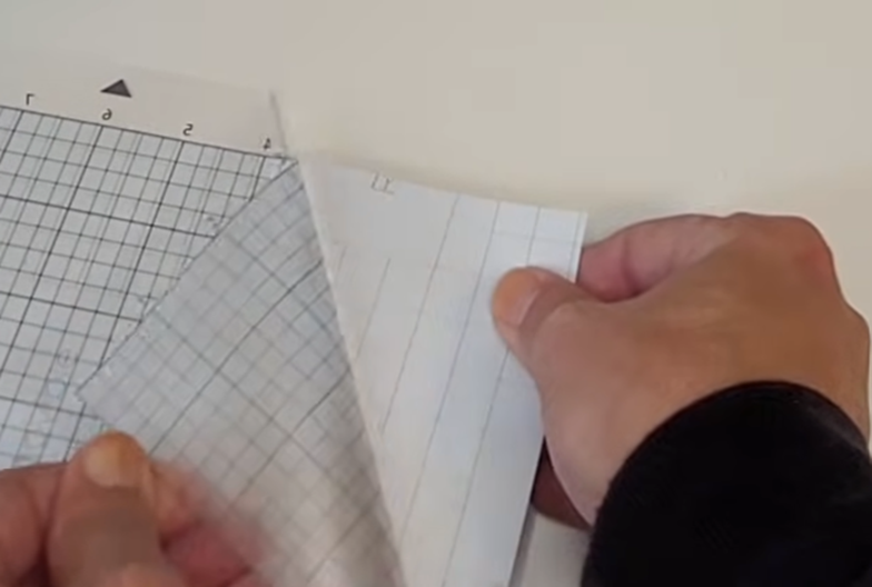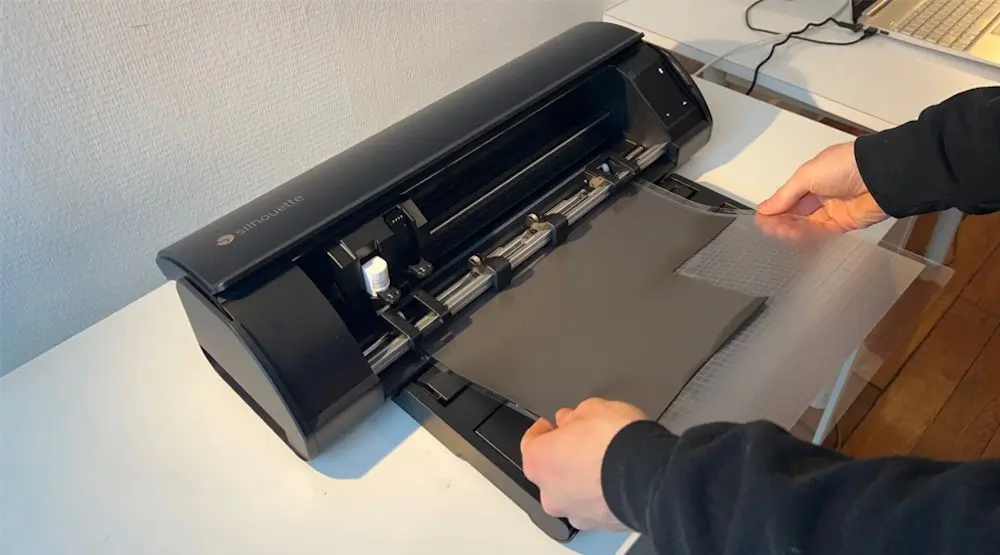 Appliquer votre matériau sur le tapis de découpe la ou vous souhaitez faire la découpe. Attention à ne pas mettre ses doigts ou autres choses que le matériau sur le tapis pour ne pas le salir