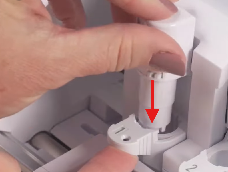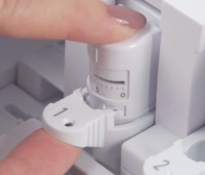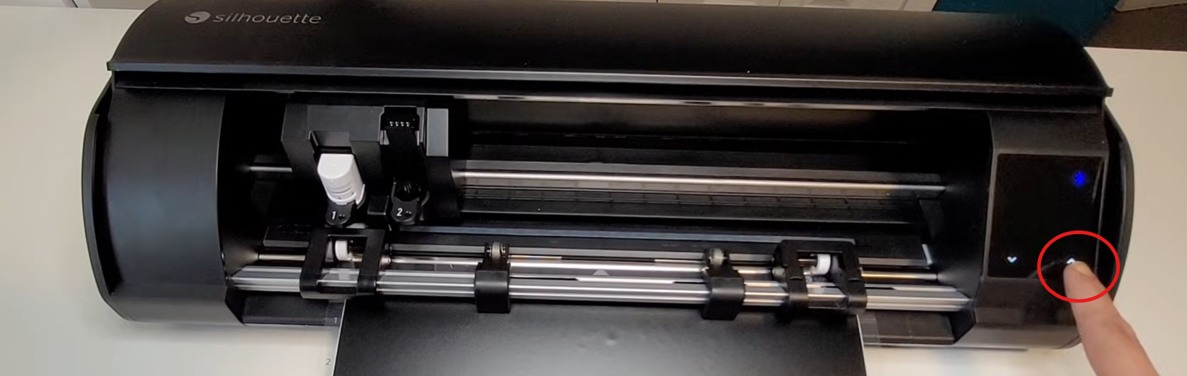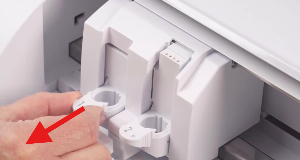 Pour insérer un outil de découpe, il suffit de tirer la languette du chariot d'outil numéro 1 comme indiqué ci-dessous.