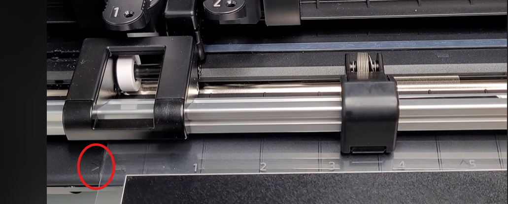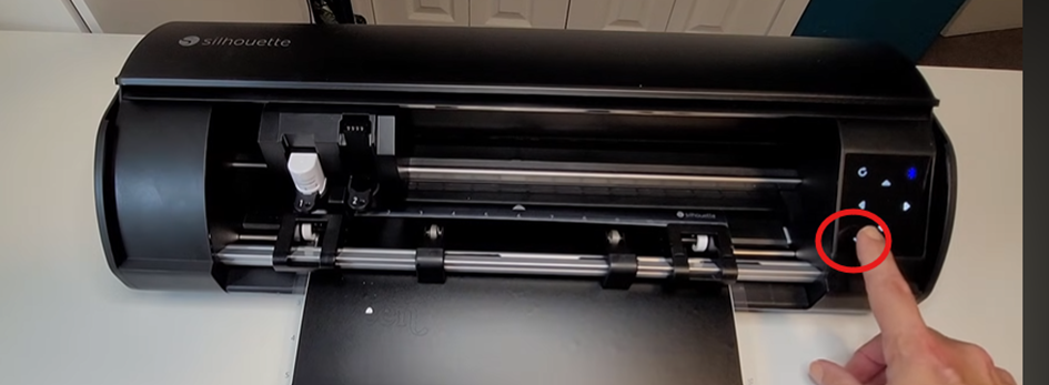 Charger le tapis de découpe dans la machine en faisant attention à bien respecter les points de repères. Puis appuyer sur la flèche qui pointe vers le haut sur le panneau de contrôle de la machine.