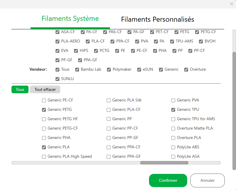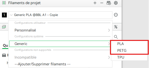 NB : Pour le type de filament, choisir “Generic” pour la marque puis le type de filament utilisé (PLA, PETG, etc…)