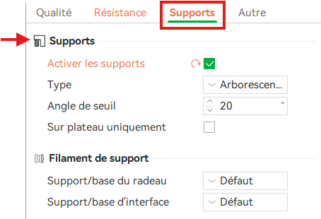 Les supports servent à soutenir les parties d’une pièce imprimée dans le vide, afin d’éviter qu’elles ne s’affaissent pendant l’impression.