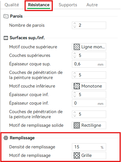 Densité de remplissage : définit le niveau de remplissage intérieur de notre pièce. Plus le pourcentage est grand, plus la pièce sera résistante mais plus elle consomme de filament et sera plus longue à l'impression.