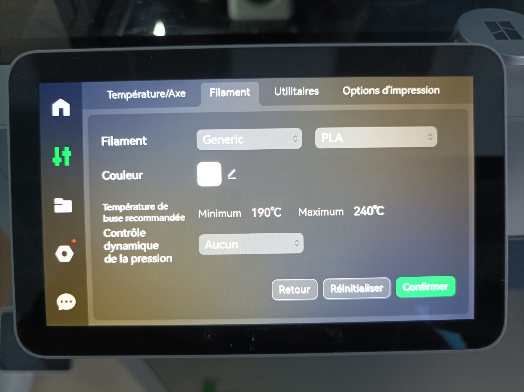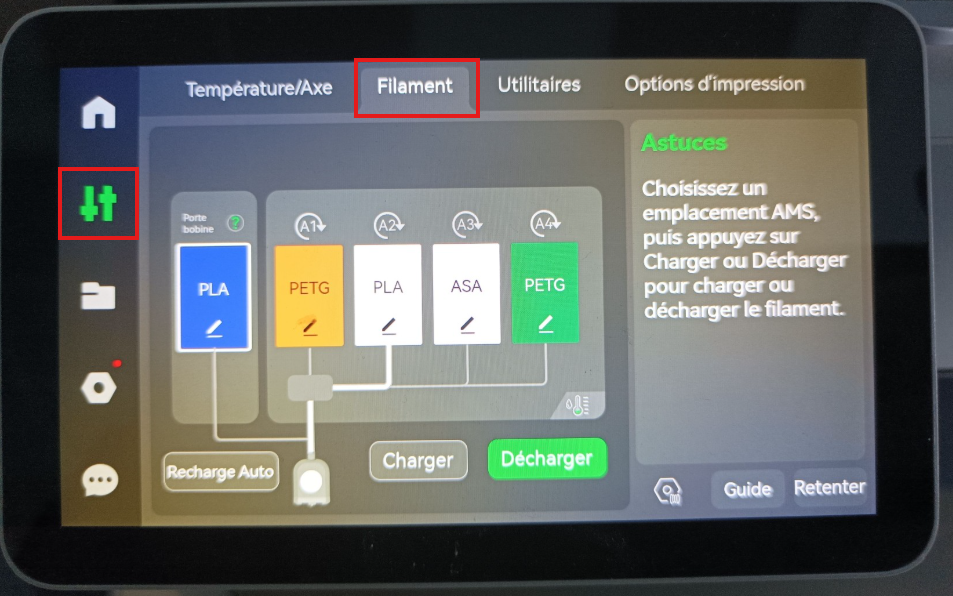 1. Allez dans le menu “Filament” sur l’écran de la machine. (deuxième onglet du menu latéral gauche puis onglet "Filament" du menu horizontal)