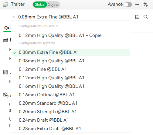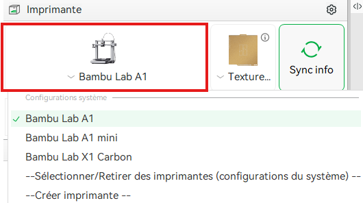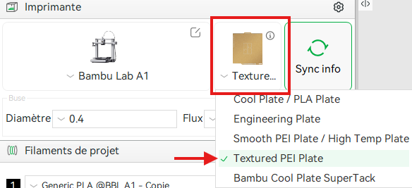 4. Choisir le type de plaque que vous souhaitez utiliser. Par défaut, pour du PLA et PETG, vous prendrez la “Bambu Lab Textured PEI Plate”.