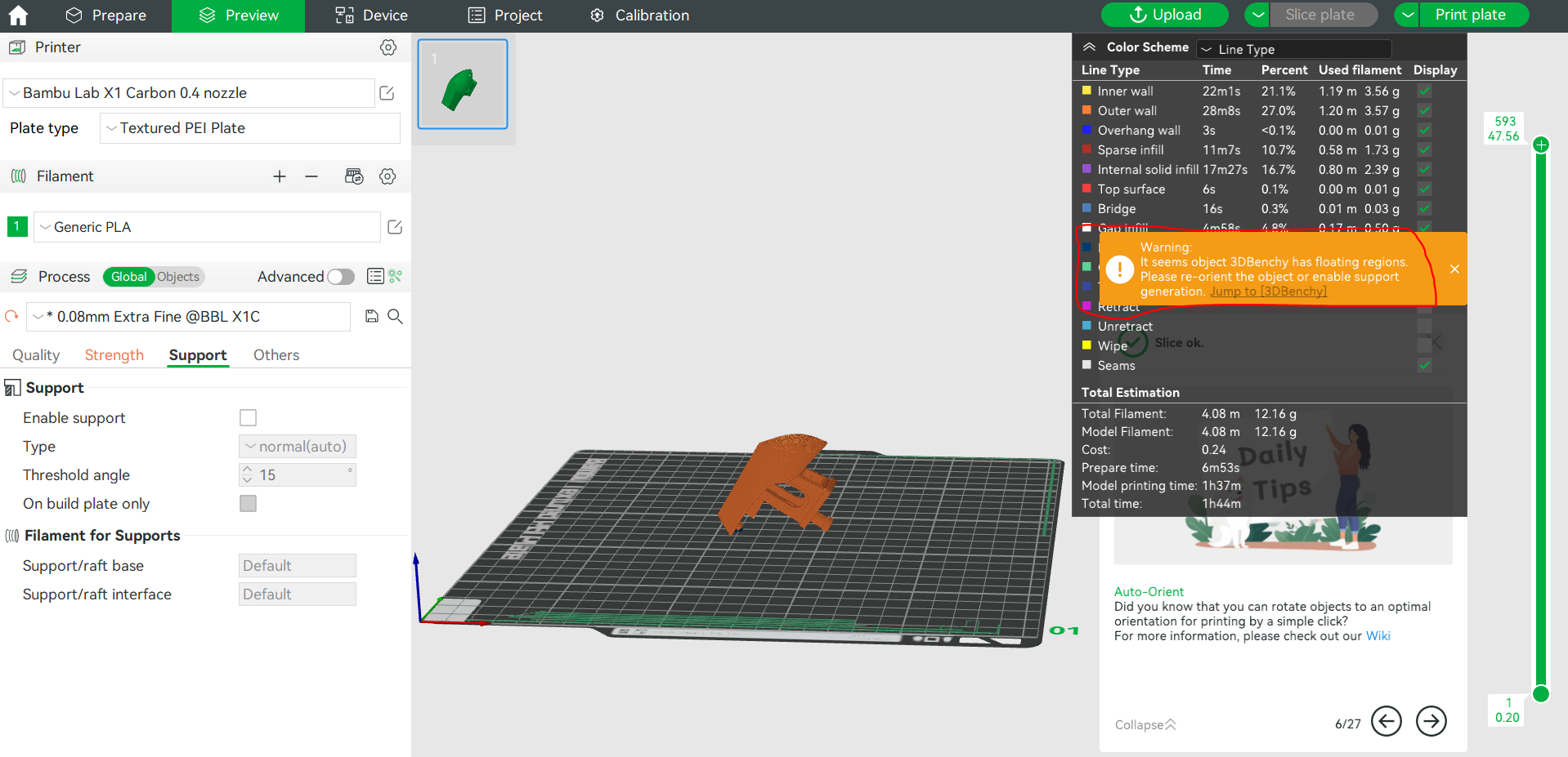 Laissez les supports désactivés et cliquez sur "Trancher plateau". Un message d’erreur en orange s'affiche (voir image ci-dessous). Vous pourrez soit réorienter la pièce en utilisant l’outil “Orientation automatique” et réessayer, soit activer les supports s'il n’y a pas d’autres solutions.