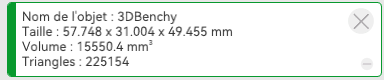 En bas à droite il y a plusieurs informations sur notre pièce telles que la taille en mm, le volume de votre pièce ainsi que le nombre de triangles que possède votre modèle 3D.