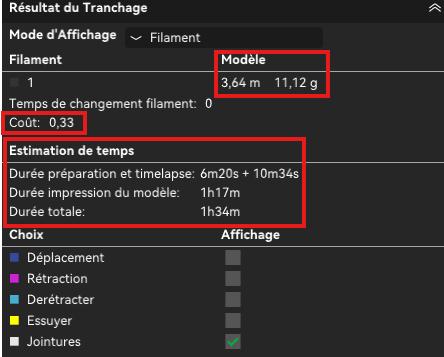 Estimation de temps : Indique le temps que prendra le modèle à s’imprimer