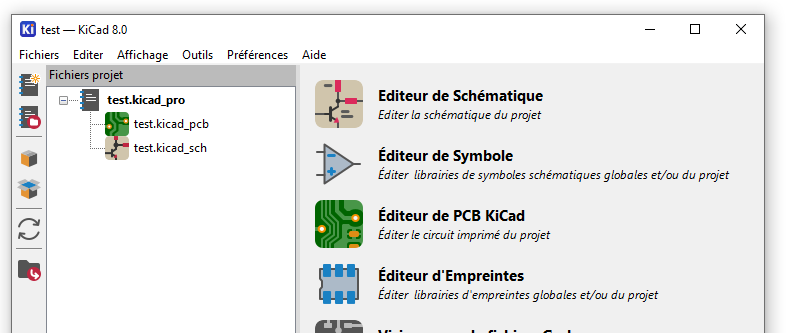 Le gestionnaire de projet KiCad est un outil qui crée et ouvre des projets KiCad et lance les autres outils KiCad (éditeurs de schémas et de cartes, visualiseur Gerber et outils utilitaires).