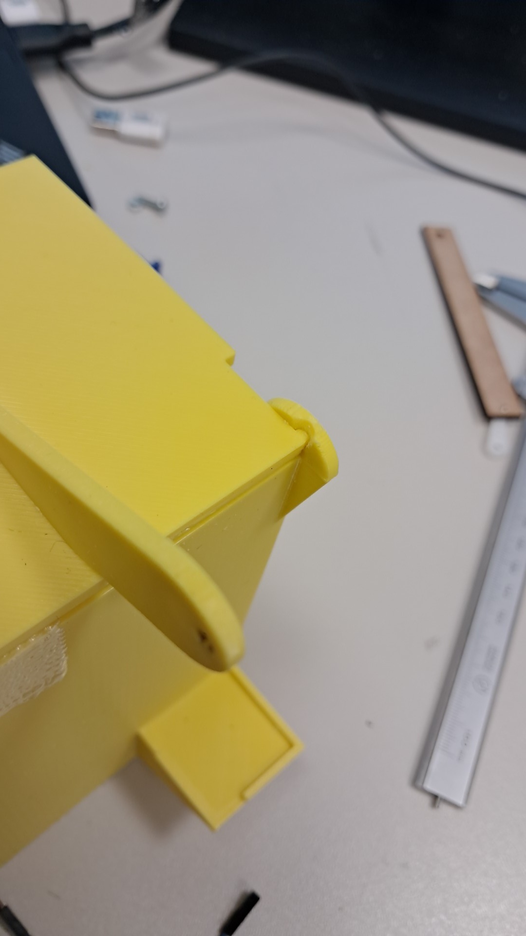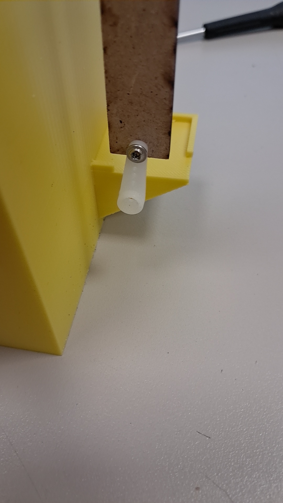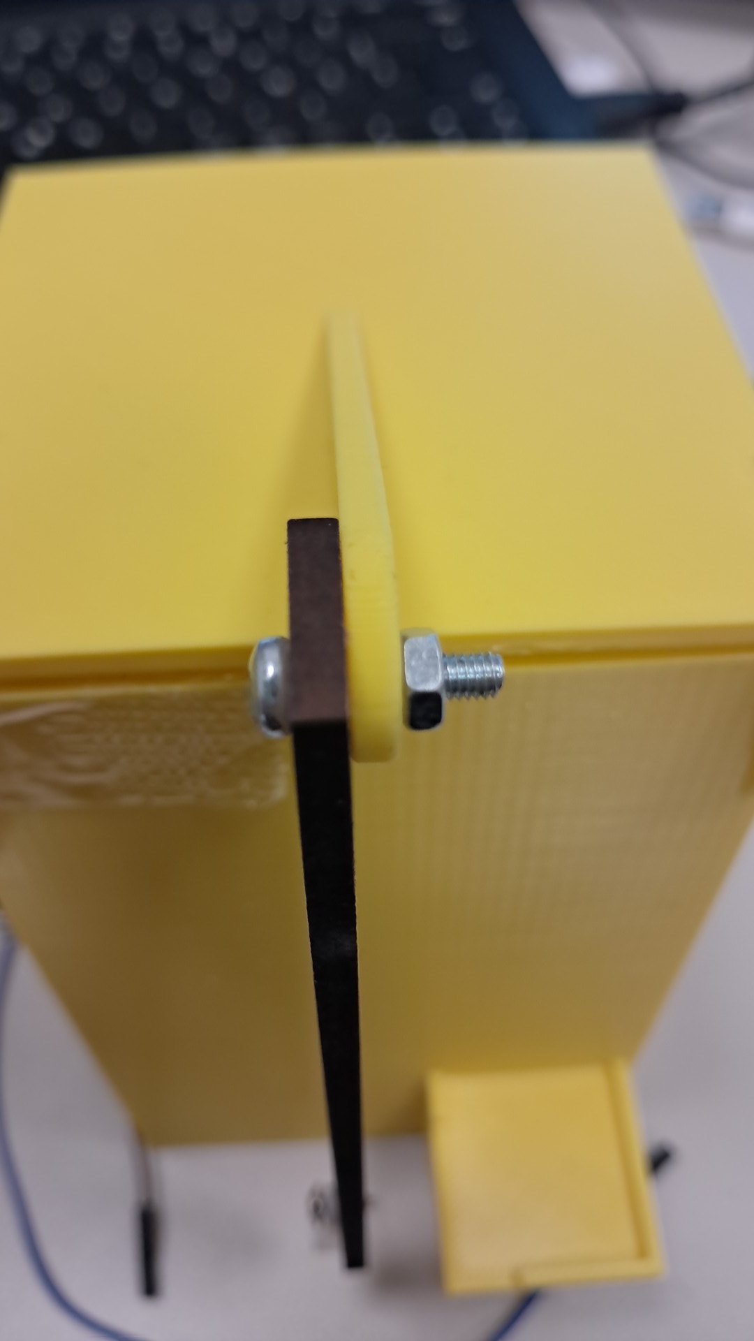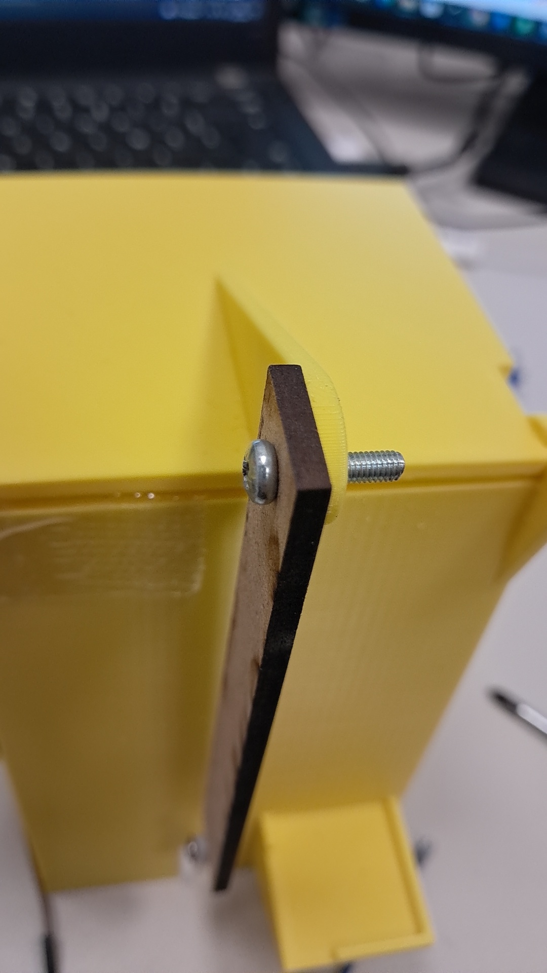 Dans le plus grand trou de la languette en bois, vous devez insérer la vis M3 12, puis l’insérer également dans la languette du couvercle, comme indiqué ci-dessous :