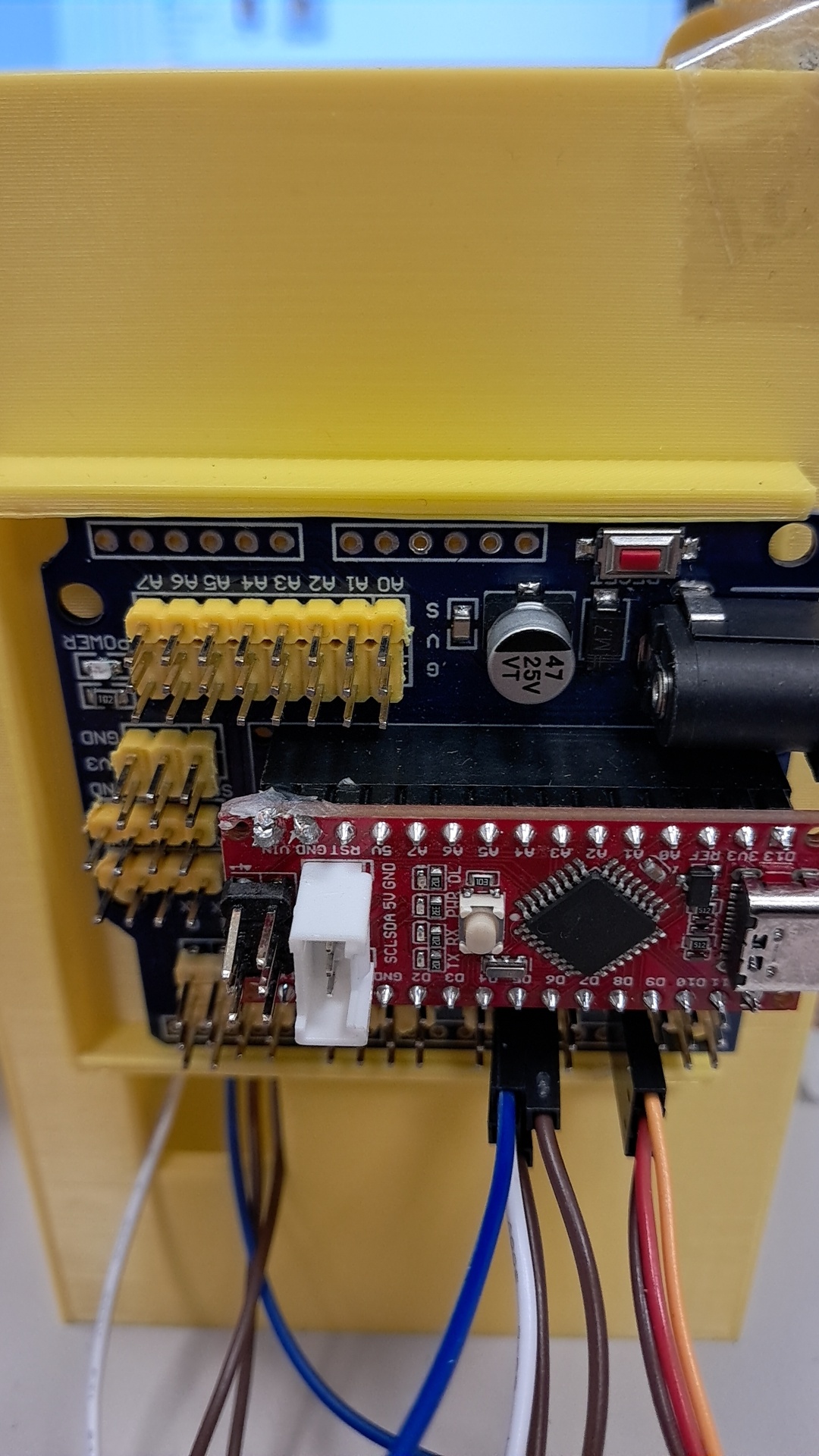 Glissez votre Arduino nano accompagné de son shield dans cette encoche représenté ci dessous :