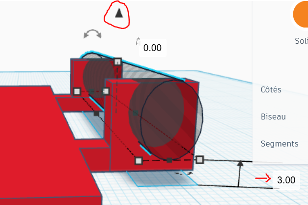 Le centrer maintenant par rapport à cette partie de la pièce (voir photo ci-dessous à gauche) et le surélever (avec la flèche noir entourée en rouge sur la photo ci-dessous à doite) de 3 mm. A présent, sélectionner le tout et les assembler.